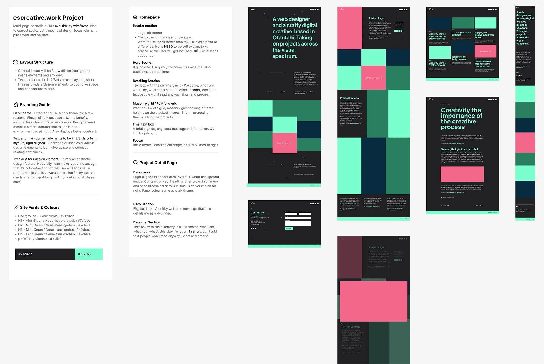Kicking off a basic process(this is just my own portfolio!) I jumped into the ocean that is portfolio site scene. Award winning portfolios, international designers, local competitors, the good and the bad. Conducting basic heuristic evaluations on the fly against my parameters, I spent a few days making lists, scribbling out basic wire-frames and flows, along with gathering direct insights from the industry experts I follow on Instagram and LinkedIn.